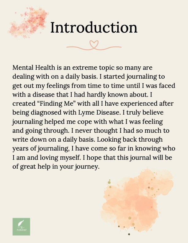 Mental health is a significant and widespread challenge that many people face daily. My own journey began with journaling as a way to process my emotions. The process became even more crucial when I was diagnosed with Lyme disease, a condition I knew very little about. This experience led me to create "Finding Me," a journal that encapsulates all I have learned. I am confident that journaling played a vital role in helping me navigate the emotional and physical toll of my illness. By reflecting on years of entries, I can see how far I have come in understanding and accepting myself. I hope this journal will offer valuable support on your own journey toward self-discovery.